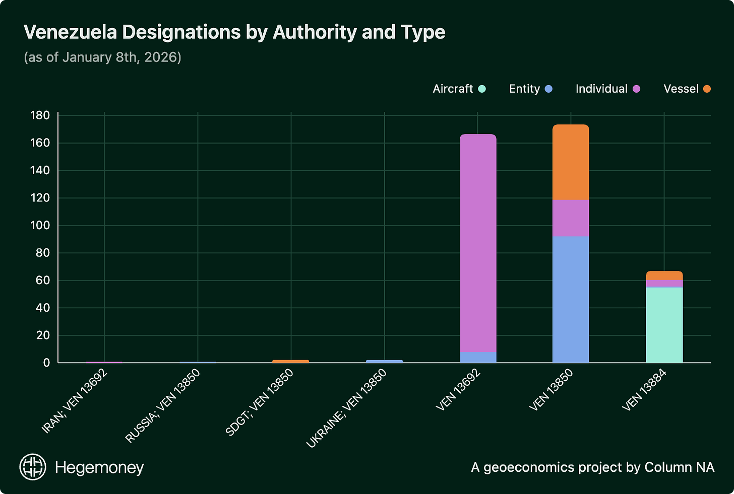 I am so happy you asked. This chart summarizes which EOs were used the most. In some cases OFAC will use multiple authorities (under multiple sanctions programs) to designate an entity. This makes it significantly more difficult for them to be removed from the sanctions list. Most vessel designations are under EO 13850 (oil sector), but recent seizures (Dec 2025–Jan 2026) often use hybrid counter-narcotics/terrorism authorities for international waters enforcement.