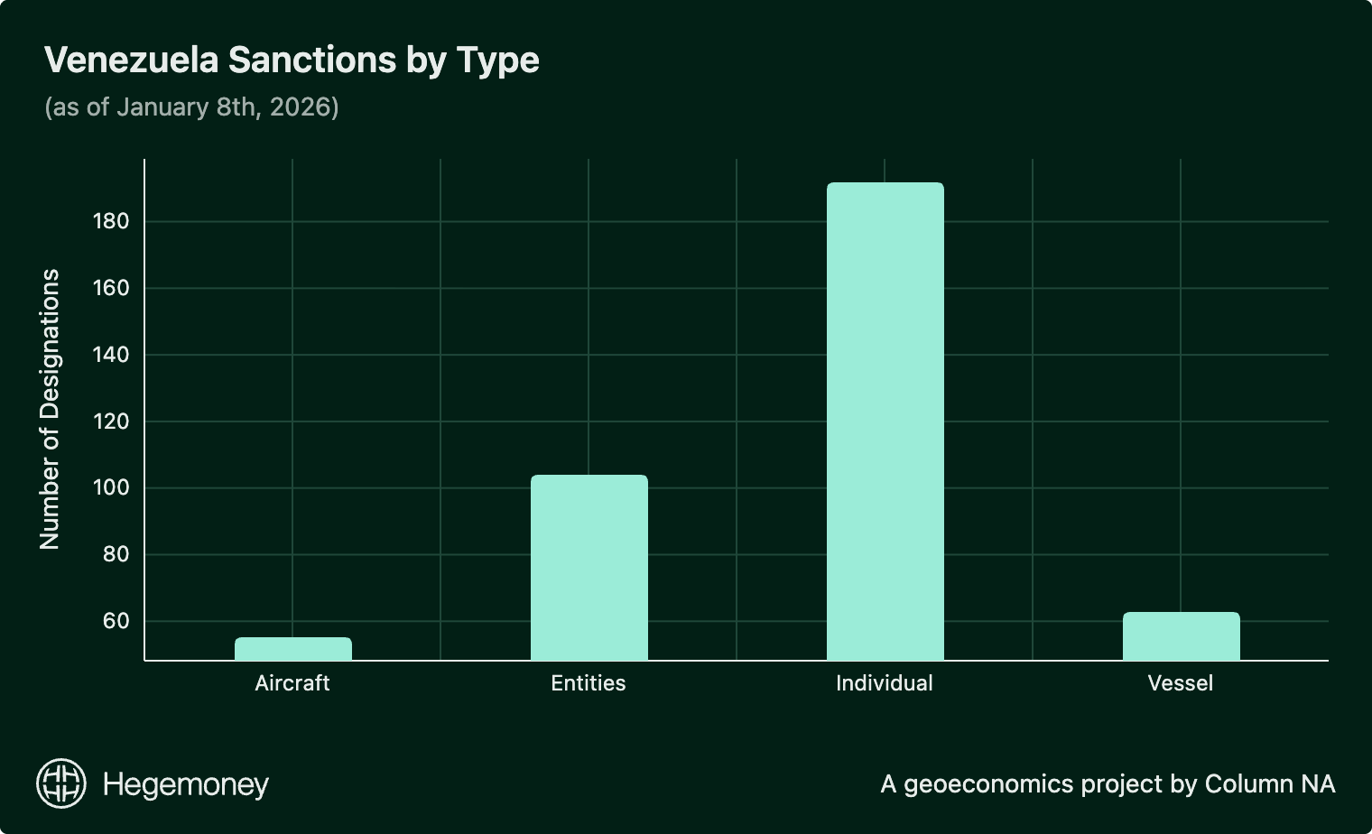 Looking at the Office of Foreign Assets Control’s (OFAC) SDN list, 414 names are currently sanctioned. That’s a combination of aircraft, entities (companies, institutions, government agencies), individuals, and ships.