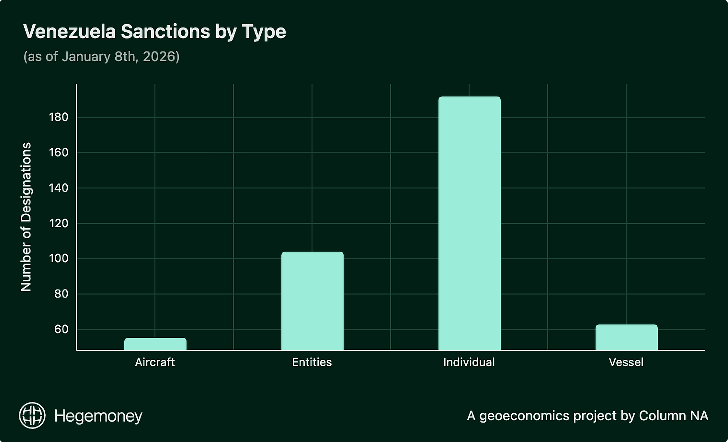 Amid the chaos, I always find it best to go back to stats and fundamentals. Instead of trying to gauge what the U.S. will do, let’s take a look at the structural barriers to doing anything: the sanctions on Venezuela and what might happen to them.