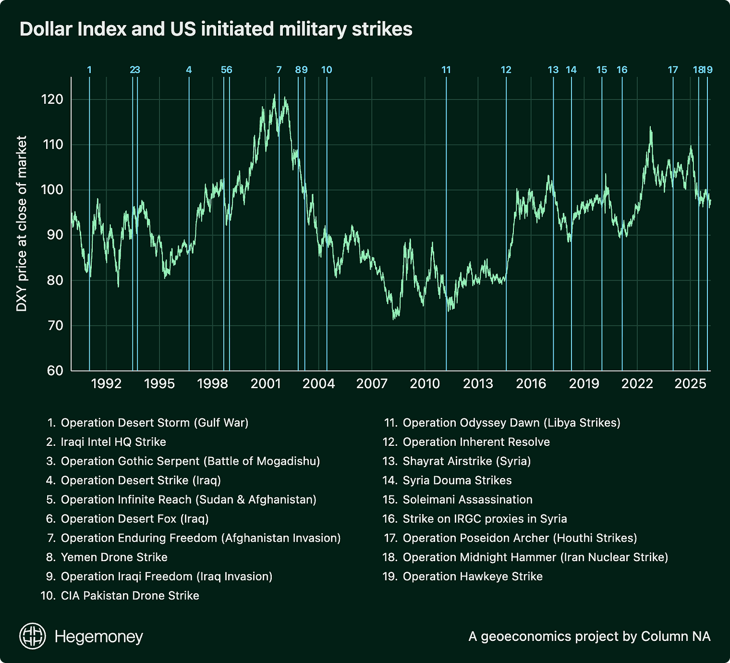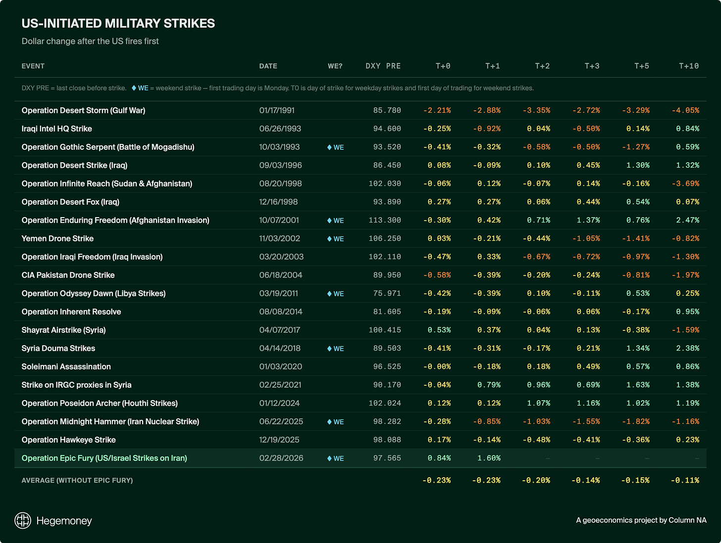 After the dollar surged on Monday, I wanted to see if this was a consistent pattern following kinetic U.S. engagement, so I looked at the behavior of the dollar index (DXY) immediately after U.S.-initiated strikes going back to 1991 — 19 events in total, from Desert Storm to the Syria strikes to the Soleimani assassination (see footnote for an explanation of the methodology for selecting these strikes)1. The pattern is counter-intuitive for a safe-haven asset. Instead of roaring higher in a universal risk-off trade, in the immediate days (1–3 days) after the strike the dollar was either down or relatively flat (moving less than 0.5%). On average, the dollar index moved -0.23% on the first trading day following the attack, and -0.15% a week after the first strike.