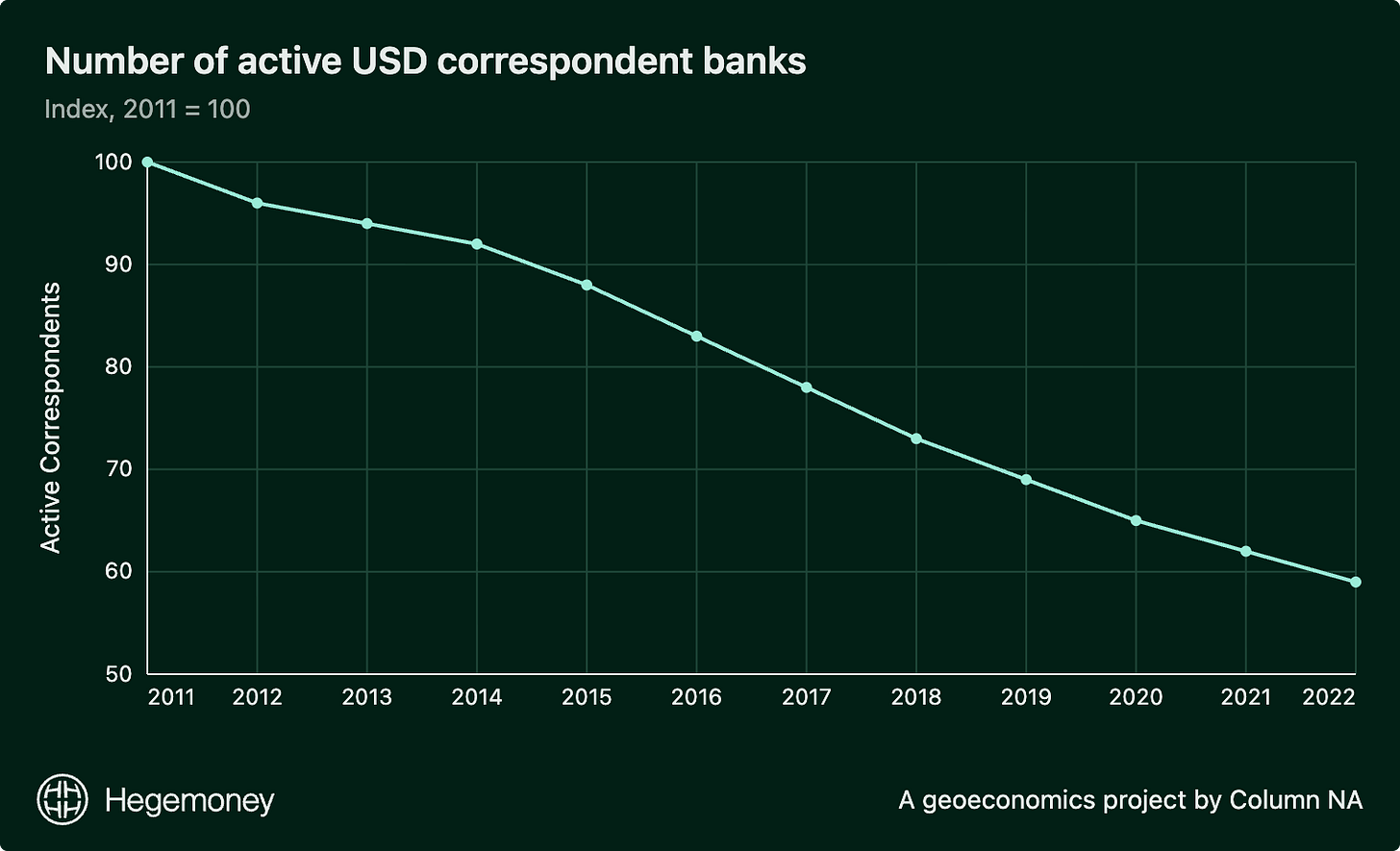 U.S. regulations have made it prohibitively expensive (and fraught on the compliance side) to distribute our payment systems in foreign markets, leading to American banks’ retrenchment from emerging markets. From 2011–2022, the number of USD correspondent banking relationships fell between 30 percent and 76 percent across regions — particularly sharply in areas like the Pacific Islands — according to a BIS study conducted with SWIFT. Though there has been a trend in de-risking across different currencies, USD correspondents have seen the deepest reduction.